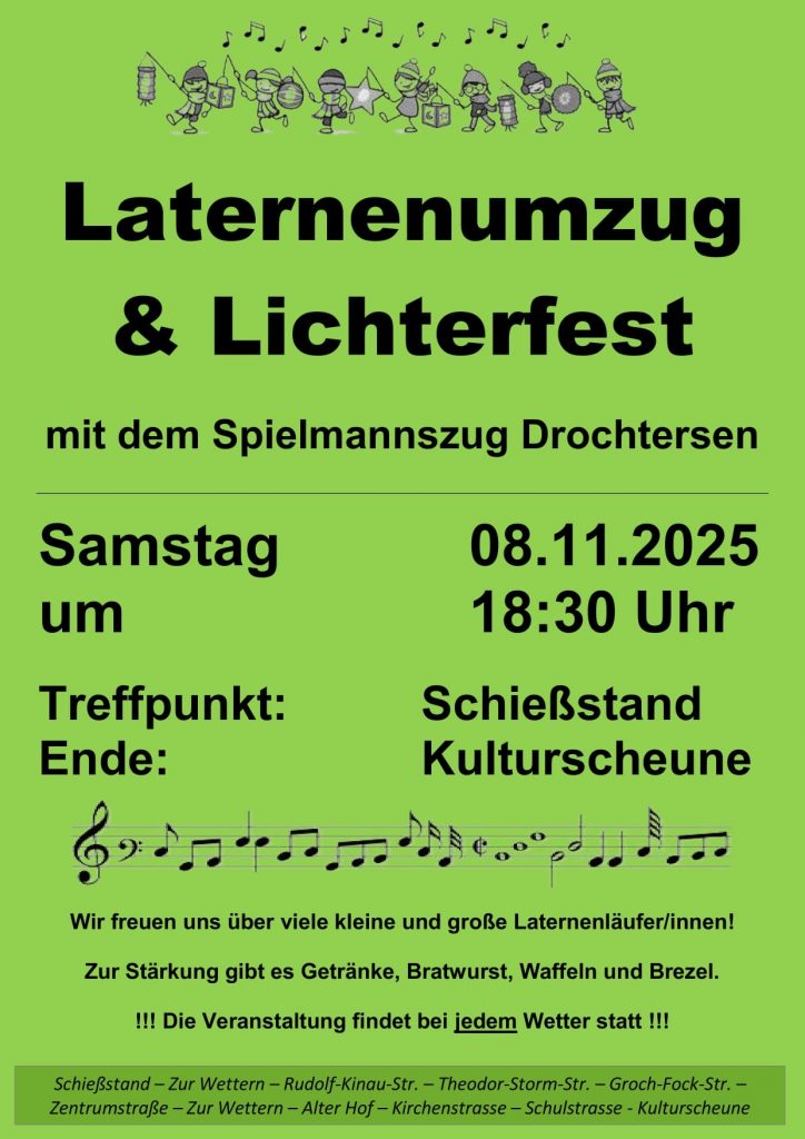 Am 08.11.2025 um 18.30 Uhr findet der Laternenumzug in Drochtersen statt. Wir freuen uns über viele Teilnehmer!